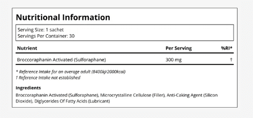 Broccoraphanin Activated Activated broccoraphanin (sulforaphane), microcrystalline cellulose (filler), silicon dioxide (anti-caking agent), diglycerides of fatty acids (lubricant)