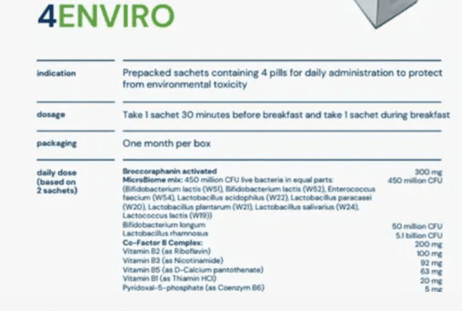 What does 4ENVIRO contain? - 4ENVIRO contains a carefully selected combination of activated broccoraphanin (sulforaphane), live bacteria strains, B vitamins, and antioxidant plant extracts including green tea and grape seed extract