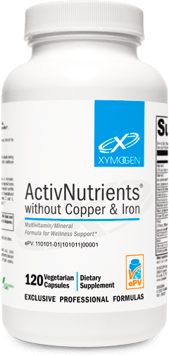 ActivNutrients® without Copper & Iron features a premium, multivitamin/mineral blend of high-quality vitamin and mineral forms selected for optimum utilization. The comprehensive nutrient profile is delivered in a vegetarian capsule and supports foundational wellness; provides antioxidant activity with vitamins C and E, selenium, and beta-carotene; and supports detoxification.