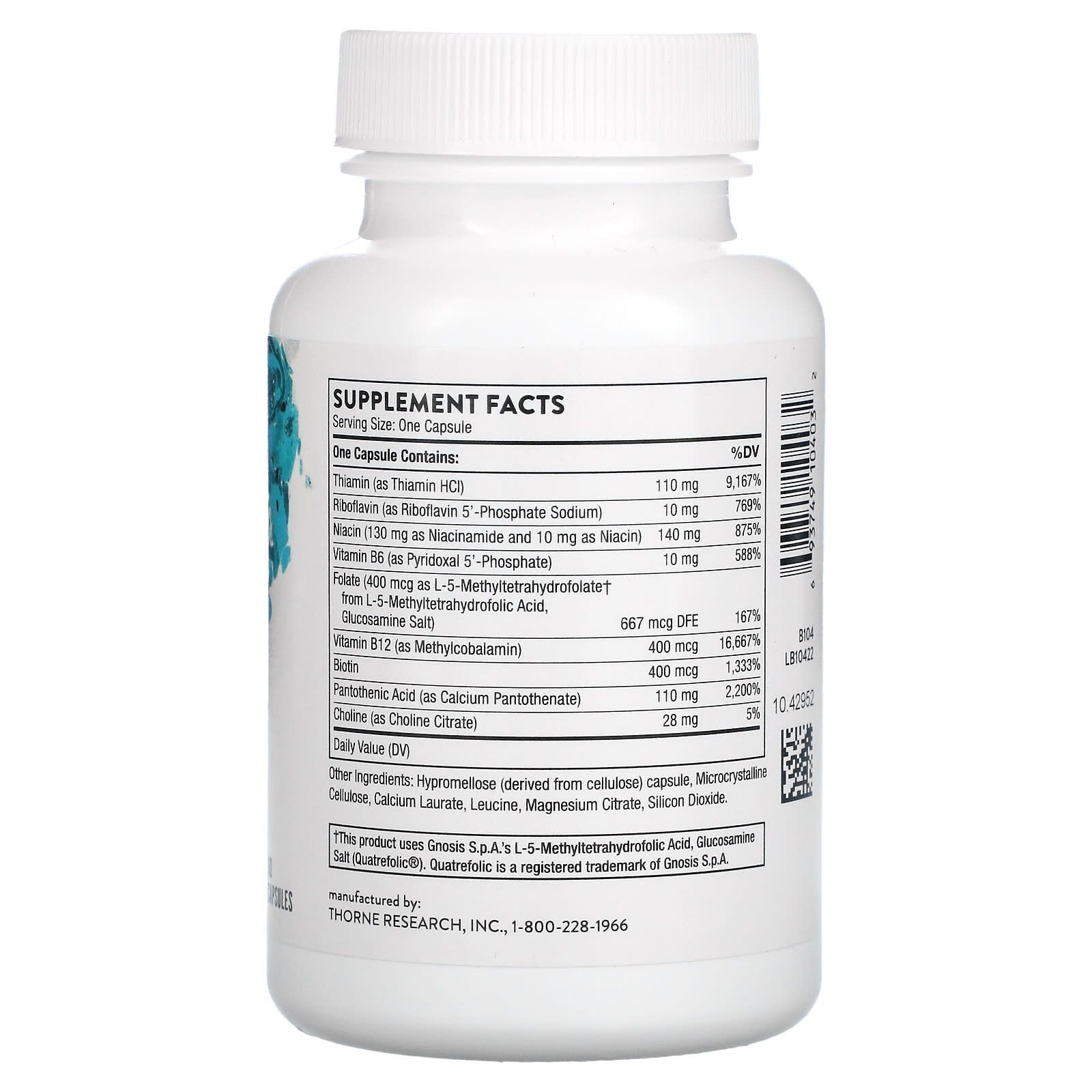 | Ingredients | Thiamin (as Thiamin HCl), Riboflavin (as Riboflavin 5'-Phosphate Sodium), Niacin (130 mg as Niacinamide and 10 mg as Niacin), Vitamin B6 (as Pyridoxal 5'-Phosphate), Folate (400 mcg as L-5-Methyltetrahydrofolate† from L-5-Methyltetrahydrofolic Acid,Glucosamine Salt), DFE, Vitamin B12 (as Methylcobalamin), Biotin, Pantothenic Acid (as Calcium Pantothenate), Choline (as Choline Citrate), Hypromellose (derived from cellulose) capsule, Microcrystalline Cellulose, Silicon Dioxide, Leucine, Magnesium Citrate. |