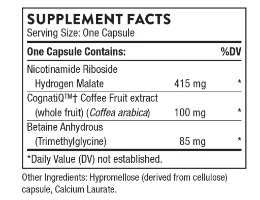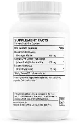 Thorne Brain Factors helps support focus, attention, and mental clarity, helping to reduce brain fog caused by stress or a busy lifestyle.* Its formula combines coffee fruit extract with Nicotinamide Riboside (NR) to support healthy levels of BDNF and NAD+, two key substances that decline with age and are critical for optimal brain function.*
