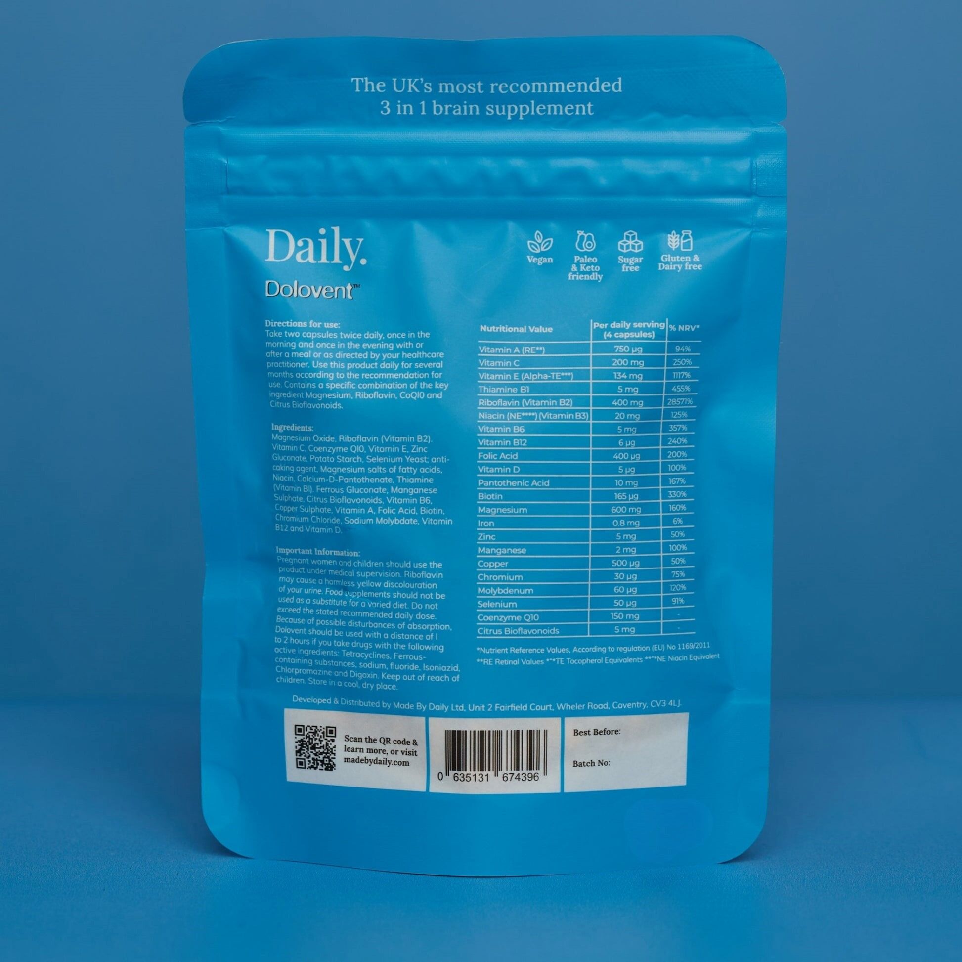 Dolovent is a naturally formulated supplement created to support brain function and help manage migraine symptoms. Each daily serving delivers a purposeful combination of magnesium, riboflavin (vitamin B2) and CoQ10, along with beneficial bioflavonoids and minerals. The formula contains no fillers, focusing only on ingredients known to contribute to energy production and neurological health.