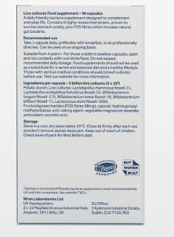 Stabiliser: potato starch; Live cultures: Lactobacillus rhamnosus Rosell-11, Lactobacillus acidophilus/helveticus Rosell-52, Bifidobacterium longum Rosell-175, Bifidobacterium breve Rosell-70, Bifidobacterium bifidum Rosell-71, Lactococcus lactis Rosell-1058; Fructooligosaccharides (FOS 88mg), vegetarian capsule: hydroxypropyl methylcellulose; anti-caking agent: vegetable magnesium stearate; antioxidant: ascorbic acid