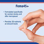 This product has been formulated specially for women during and after the menopause. The formula provides 28 nutrients at relevant levels including the trace minerals and plenty of antioxidants. FEMA45+™ provides good levels of magnesium and calcium, as well as vitamins D and K to reflect the current thinking on bone health. Additionally the B vitamins are included at significant amounts in FEMA45+™ and several of them are known to contribute to the reduction of tiredness and fatigue.