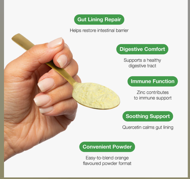 | Ingredients | L-glutamine, flavours: orange, citric acid, flavour; quercetin, L-alanyl-L-glutamine, sweetener: steviol glycosides, zinc citrate. |