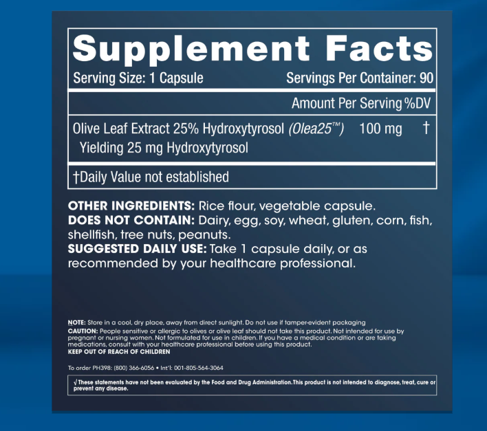 | Ingredients | Olive (Leaf) Extract 25% Hydroxytyrosol |