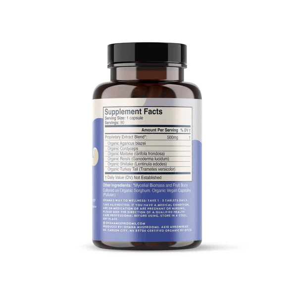 | Ingredients | Other Ingredients: Mycelial Biomass and Fruit Body Cultured on Organic Sorghum. Organic Vegan Capsules (Pullulan) |