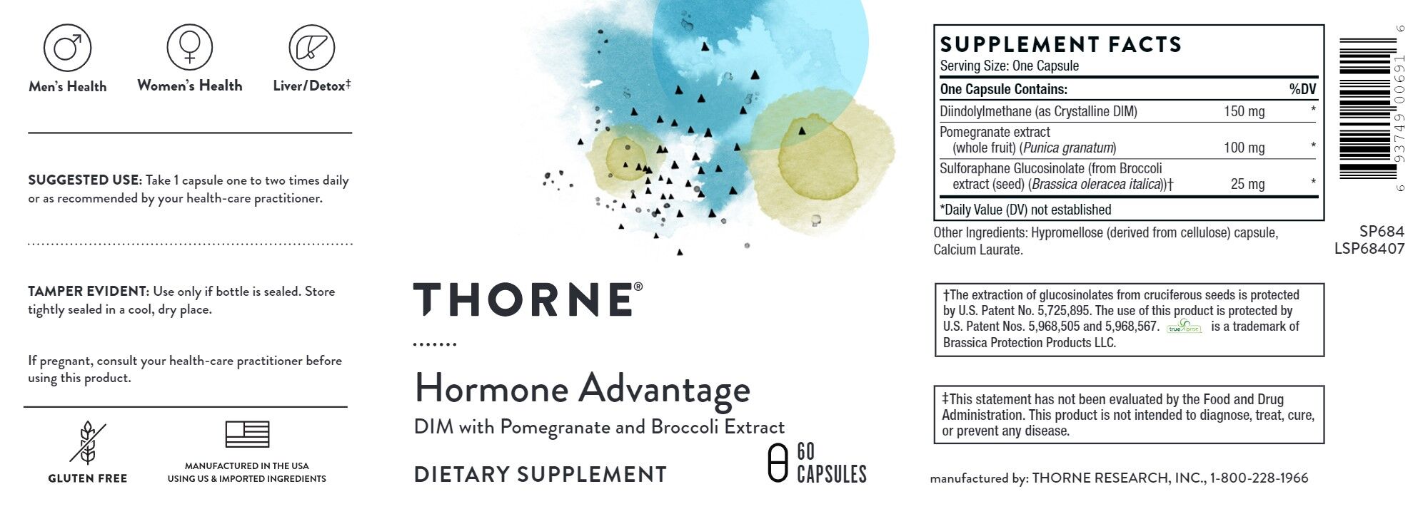 Thorne’s Hormone Advantage (formerly DIM Advantage) combines diindolylmethane (DIM), pomegranate extract, and sulforaphane glucosinolate (SGS; from broccoli seed extract) to support balanced hormone health by helping the body metabolize and detoxify excess estrogen.*