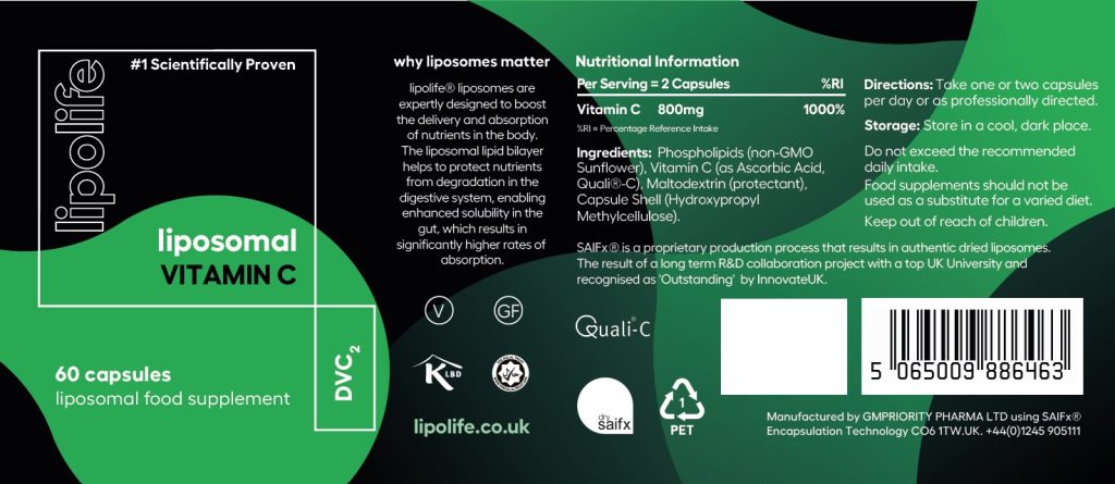 Phospholipids (non-GMO Sunflower), Vitamin C (as Ascorbic Acid, Quali®-C), Maltodextrin (protectant), Capsule Shell (Hydroxypropyl Methylcellulose).