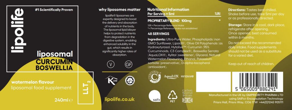 Ultra-Pure Water, Phospholipids (non GMO Sunflower, Lipoid), Olive Oil Polyphenols (as Hydroxytyrosol, Hytolive™) Curcumin (95% Curcuminoids, C3 Complex), Boswellia Serrata (AquaLOX®), Xylitol (sweetener), Glycerol, Ethanol, Natural Watermelon Flavouring, Potassium sorbate (preservative), D-alpha-tocopherol (antioxidant).