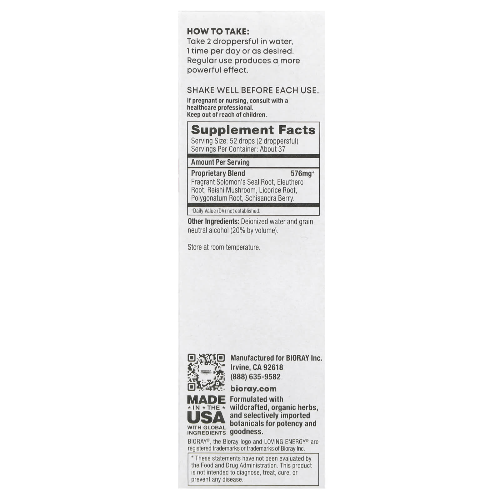 | Ingredients | Fragrant Solomon's Seal Root, Eleuthero Root, Reishi Mushroom, Licorice Root, Polygonatum Root, Schisandra Berry, Deionized Water and Grain Neutral Alcohol (20% by volume). |