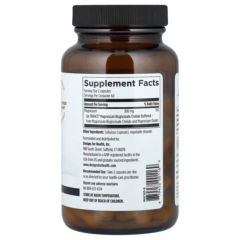Designs for Health Magnesium Glycinate Complex provides 150 mg of well-absorbed elemental magnesium in each vegetarian capsule, using a gentle chelated glycinate form. This type of magnesium is known for its high bioavailability, making it easier for the body to absorb and less likely to cause digestive discomfort compared to other forms. Many people use magnesium glycinate to support relaxation, healthy sleep patterns, muscle comfort, and overall nervous system function. It also plays an essential role in energy production, bone health, and maintaining steady blood sugar levels. Because this formula is designed to be easy on the stomach, it is suitable for daily use and for individuals who are sensitive to more aggressive magnesium supplements.
