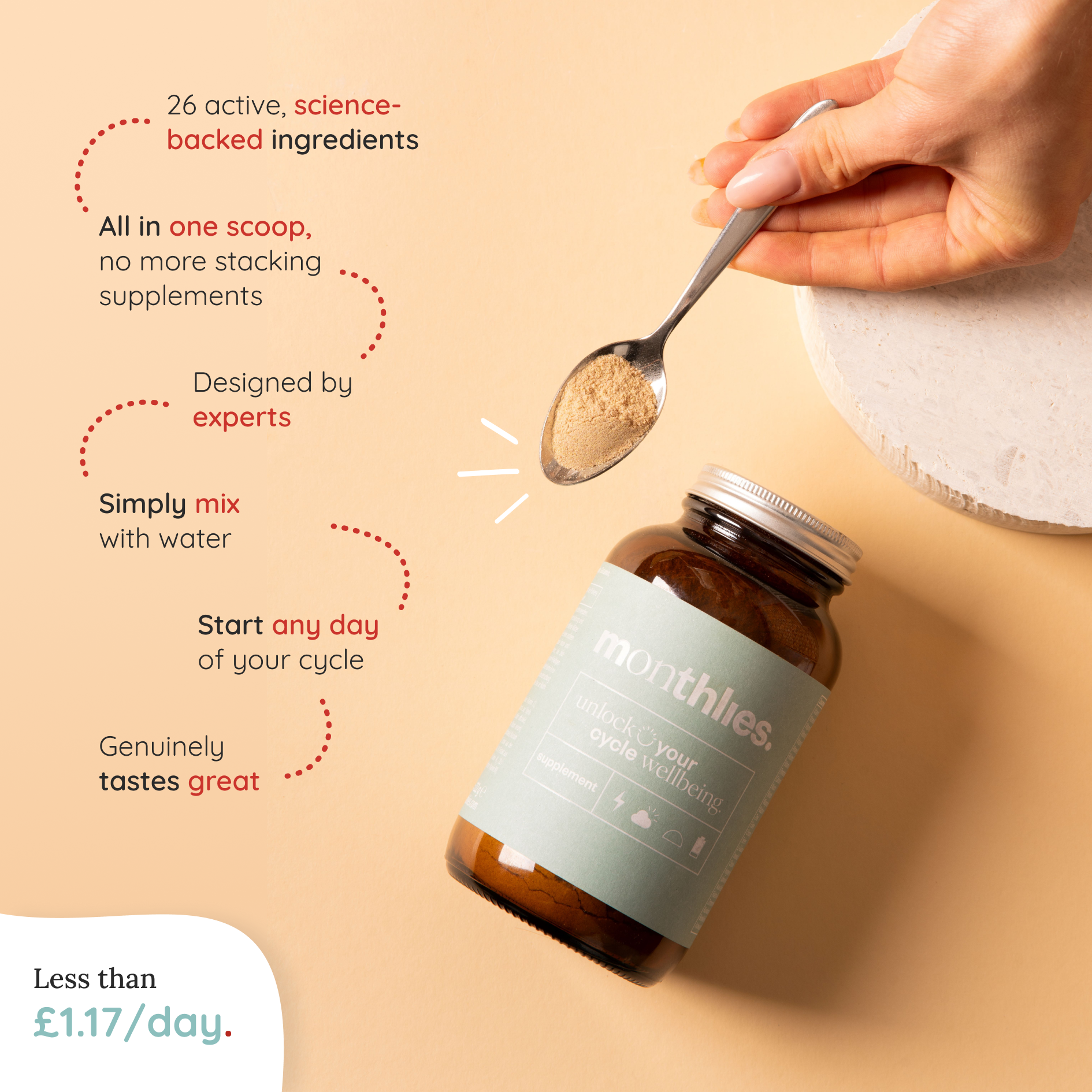 A powder also makes your daily routine easier. Instead of remembering to take multiple supplements, you get your all-in-one support with a simple scoop. monthlies is created to be versatile, blending smoothly into your favourite drink - making it convenient, effortless and enjoyable to take every day.