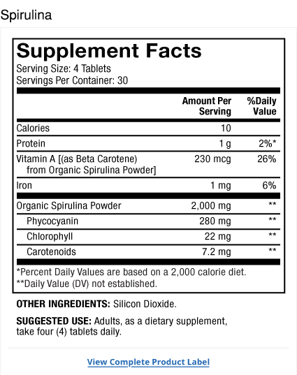 | Ingredients | Organic Spirulina Powder (Phycocyanin, Chlorophyll, Carotenoids), Silicon Dioxide. |