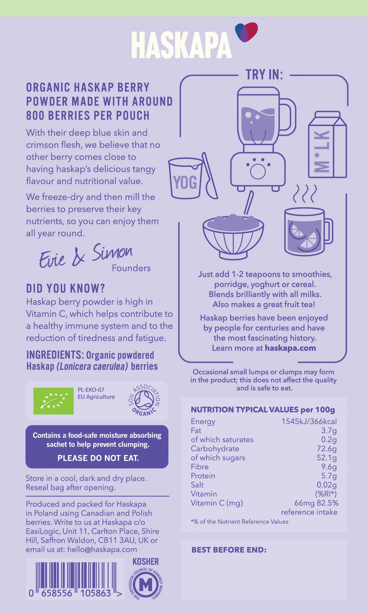 - An organic version of thesignature pure berry powder - certified by the UK Soil Association, this organic freeze-dried haskap berry powder is made with the whole berry and nothing else added.