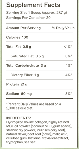 | Ingredients | Other Ingredients: Hydrolyzed bovine collagen, MCT oil powder (coconut MCT, gum acacia), strawberry powder, inulin (chicory root), natural flavor, beet root (color), malic acid, cellulose gum, histidine, stevia leaf extract, tryptophan, sea salt |