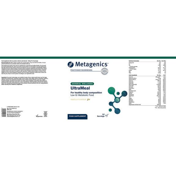 UltraMeal™ is a nutritional food supplement that is low in calories but high in protein, vitamins and minerals designed to support healthy body composition and blood sugar balance. UltraMeal™ provides a comprehensive range of nutrients scientifically selected to support healthy blood sugar metabolism thus helping to ensure that your lean muscle mass (energy reserves) is preserved at all times.