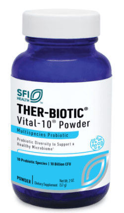 Ther-Biotic® Vital-10® provides a synergistic blend of indigenous, essential colonizing, and beneficial transient probiotic microorganisms. The Lactobacillus species normally predominate in the small intestine while the Bifidobacterium species are important for the colon. Vital-10® supplies beneficial probiotic organisms generally not present in modern, highly processed foods together with indigenous species whose numbers decline with age, medication, and stress. Two transient yogurt starter species with long histories of health benefits are blended into the formulation. Together they maintain a healthy, balanced intestinal microbiota, promote normal gastrointestinal function, synthesize B vitamins and vitamin K, facilitate nutrient and mineral absorption, and support normal intestinal and systemic immune functions.