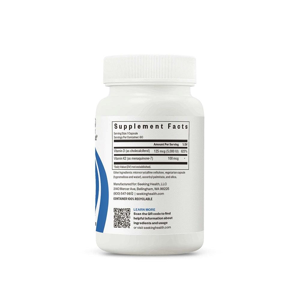 Vitamin D3 + K2 by Seeking Health contains 125 mcg (5000 IU) of D3 (as cholecalciferol) and 100 mcg of K2 (as menaquinone-7) in an easy-to-swallow capsule. The cholecalciferol form of vitamin D3 used in this product is derived from cholesterol in sheep’s wool, making it suitable for vegetarians. Vitamin K2 is provided as menaquinone-7, one of the most studied forms of this important nutrient.
