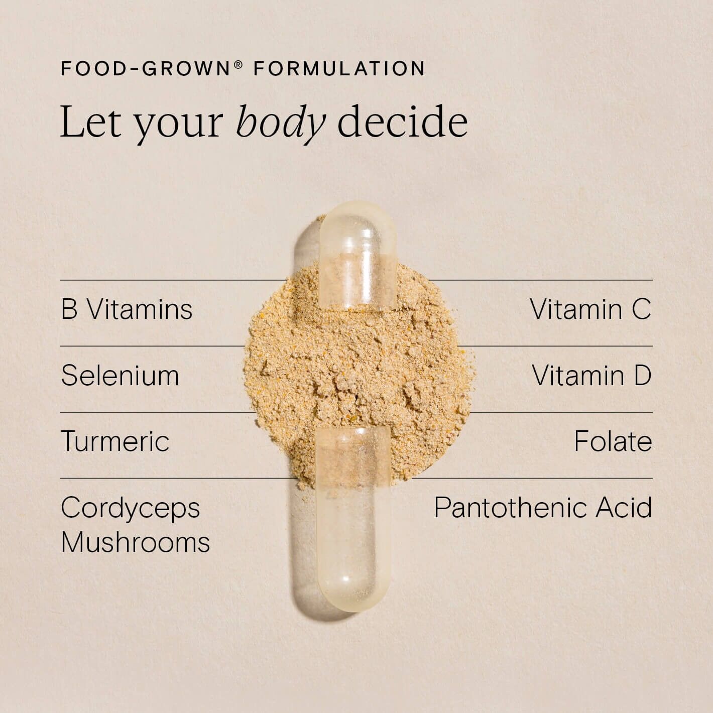| Ingredients | Lithothamnium Calcareum (Red algae) powder (providing Calcium), Nutrient-enhanced Yeast (providing Selenium, Inositol, Boron, Iron, GTF Chromium, Niacin, Manganese, Riboflavin, Vitamin B6, CoEnzyme Q10, Choline, Biotin, Folic acid [as naturally occuring Folate], Thiamin, Molybdenum, Iodine, Vitamin K1, Vitamin B12 and Vitamin D3), Purified Seawater (providing Magnesium), Nutrient-enhanced Lactobacillus Bulgaricus (providing Zinc, Copper and Pantothenic acid), Vegetable cellulose (capsule shell), Citrus pulp (providing Vitamin C and Bioflavonoids), Carrot concentrate (providing Beta-carotene), Betaine Hydrochloride, Turmeric powder, Cordyceps Sinensis powder, Nutrient-enhanced Yellow Pea (Pisum sativum) preparation (providing Vitamin E) and Alpha Lipoic acid. May contain heat-treated Brown Rice powder |