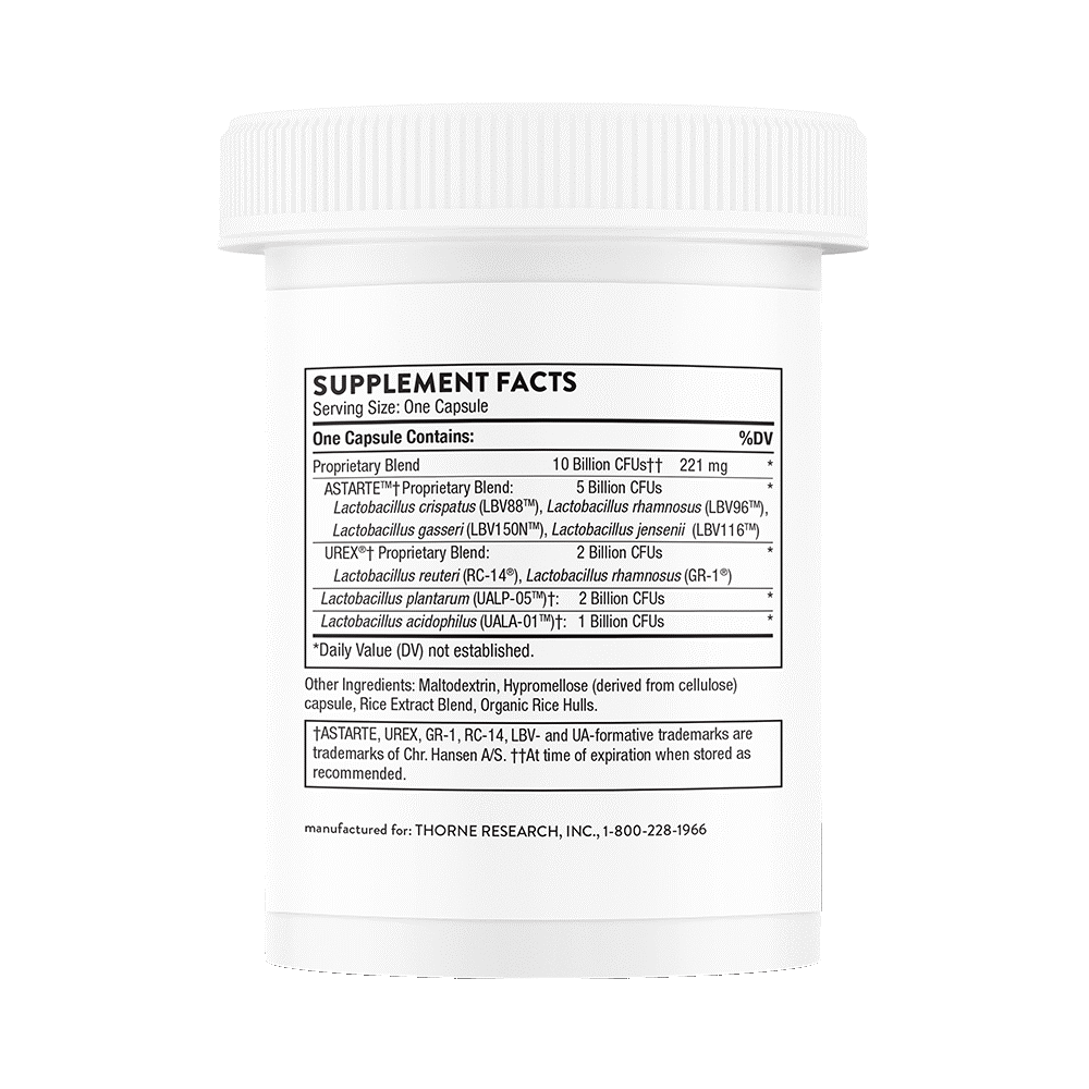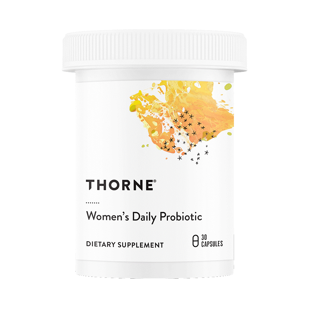 Thorne Women’s Daily Probiotic is a thoughtfully formulated supplement designed to support women’s digestive, vaginal, and urinary tract health. It provides a blend of well-researched probiotic strains that help maintain a healthy balance of beneficial bacteria in the gut and intimate microbiome. By supporting microbial balance, this probiotic may help ease occasional digestive discomfort such as bloating while also contributing to overall immune and metabolic health. Each capsule delivers approximately 10 billion CFUs and is shelf-stable, meaning it does not require refrigeration and is convenient for daily use at home or while travelling. The formula is free from gluten, dairy, soy, and other common allergens, making it suitable for many dietary needs. With a simple once-daily dose, it’s an easy way to support everyday wellbeing as part of a healthy routine.
